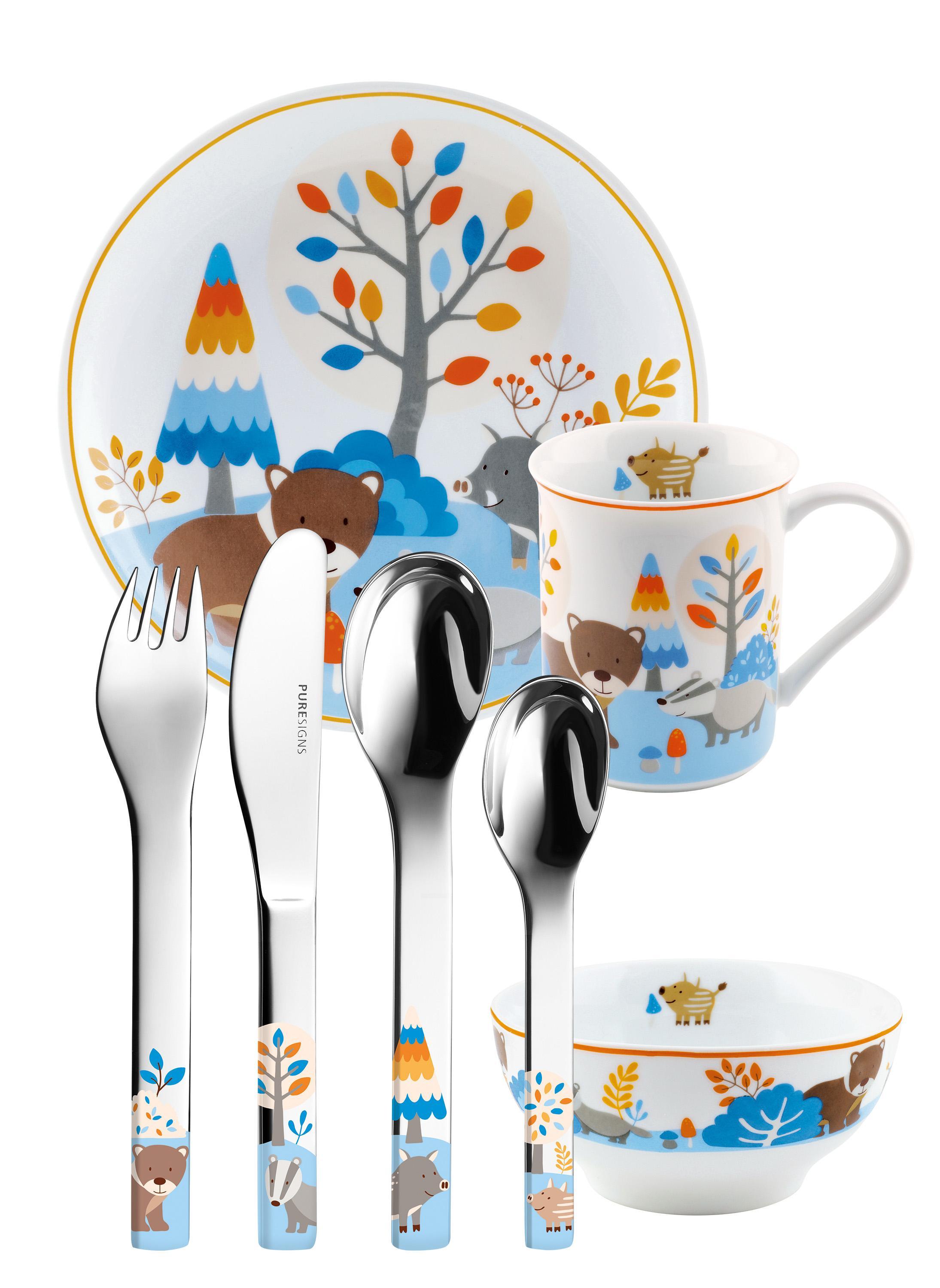 PURESIGNS Kindergeschirr "Friends" 7-teilig. Inhalt: Besteck 4-teilig, je 1 x Gabel, Messer, Löffel, kleiner Löffel, aus Edelstahl 18/10. Geschirr 3-teilig, je 1 x Teller, Tasse, Schale, aus Porzellan. Für Kinder ab 2-3 Jahren. In Ihrer bunten Welt leben die Tiere des Waldes in einer friedlichen Gemeinschaft in der sich Dachs, Bär und die kleine Wildschweinfamilie als untrennbare Freunde gegenseitig helfen und gemeinsam viele spannende Abenteuer erleben. Alle Teile sind ideal für kleine Hände geformt und weisen abgerundete Kanten auf, um potenzielle Verletzungen zu vermeiden. Spülmaschinengeeignet.Lieferumfang: