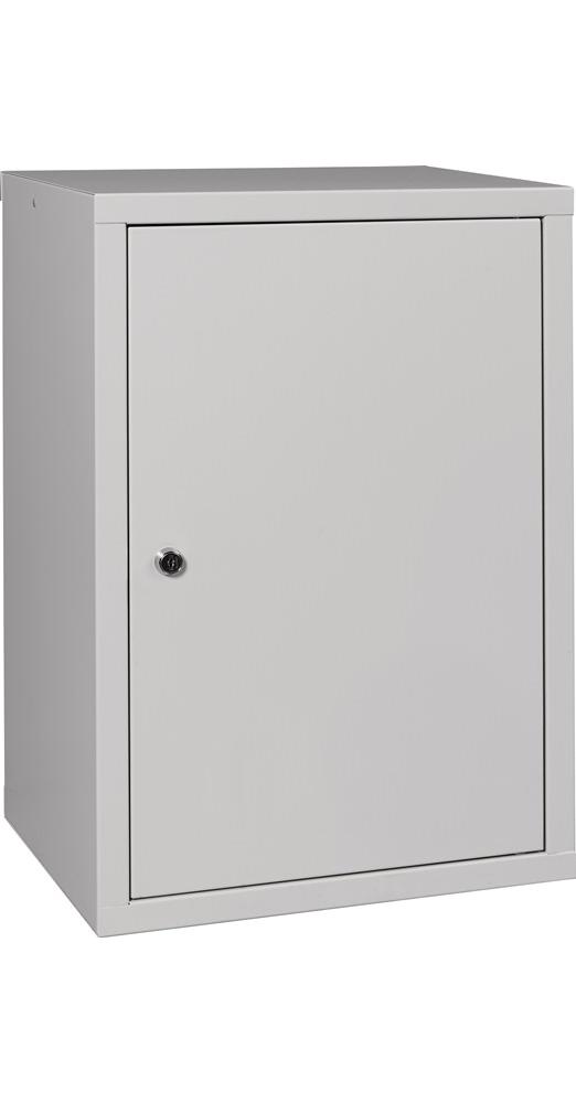 stabile Stahlblechkonstruktion, pulverbeschichtet · Türen aus Vollblech, abschließbar mit Zylinderschloss · Fachboden höhenverstellbar, Tragfähigkeit 15 kgWeitere technische Eigenschaften: