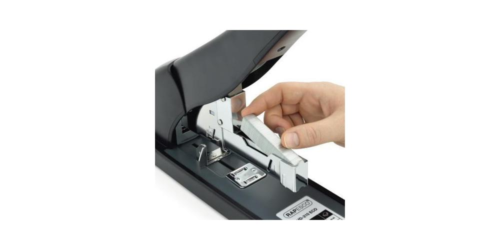 Als Teil der Rapesco ECO Reihe ist dieses starke Heftgerät mit recyceltem Plastik hergestellt. Neben einer Vollstreifen Frontladung durch Knopfdruck bietet dieses Heftgerät außerdem einen weichen Gummihebelgriff für Benutzerkomfort und Antirutsch-Füße für eine verstärkte Stabilität – besonders hilfreich beim Heften größerer Mengen. Das Heftgerät hat außerdem noch eine einrastende Papierführung.Attribute