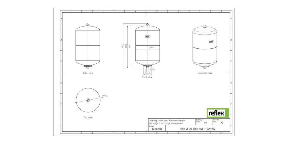 Refix DE Nicht durchströmtes Membran· Druckausdehnungsgefäß für Wasserversorgungsanlagen · die nicht der DIN 1988 unterliegen · z.B. Feuerlösch· und Betriebswassersysteme · Fußbodenheizungen oder Wärmequellenanlagen. Gefäße sind konstruiert und gefertigt nach DIN EN 13831. Zulassung gemäß Richtlinie für Druckgeräte 2014/68/EU. ·Vollmembran nach DIN EN 13831 / ab 50 Liter tauschbar ·Für Frostschutzmittelzusatz mindestens 25 bis 50 % ·Wasserberührende Teile korrosionsgeschützt ·Langlebige Epoxidharzbeschichtung ·33 Liter mit Befestigungslaschen · ab 50 Liter mit Füßen ·Folgende Typen inkl. Manometer: = 10/16 bar: ab D= 1.000 mm = 25 bar: ab D= 450 mm ·Manometer und Vordruckventil durch Metallbügel geschützt Hinweis: Bewilligungspflicht gemäß Schweizer Richtlinie SWKI HE301·01 und SVTI bei (PSV * VN <= 3.000 bar * Liter).Weitere technische Eigenschaften: