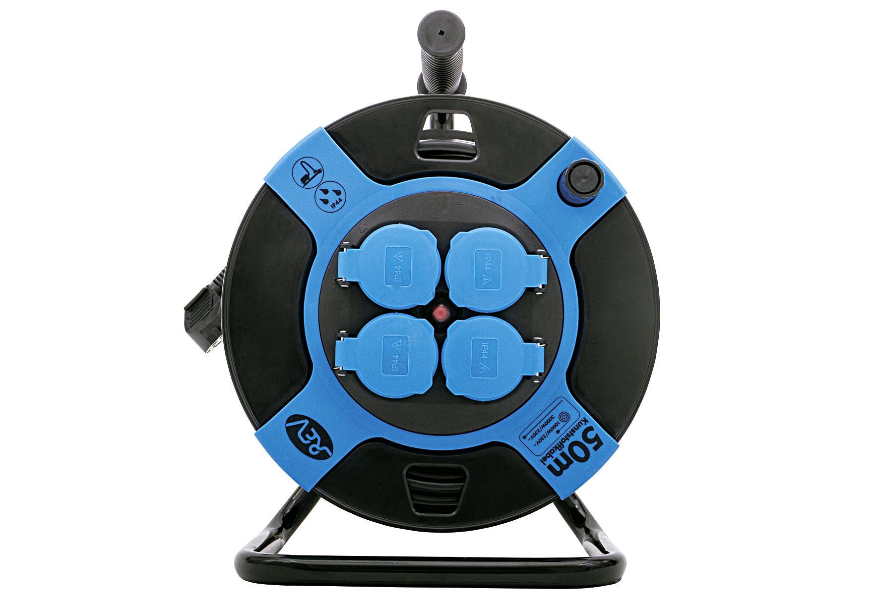 Trommelscheiben aus schlagfestem Kunststoff, 4 spritzwassergeschützte Schutzkontaktsteckdosen, VDE, ÖVE, Gummi-Schutzkontaktstecker, Thermoschalter als Überhitzungsschutz mit integrierter Wiederanlaufsperre, mit erhöhtem Berührungsschutz, Ständer aus lackiertem Stahlrohr, federnde Lagerung des Trommelkörpers, zur vorübergehenden Verwendung im Freien, IP 44, Feststellbremse, verschiebbar, Kabelclip zur Leitungsfixierung, REV-Qualitätsleitung H05VV-F 3G1,5 - VDE-HAR, 50 m PVC Kabel, drehbarer Wickelgriff und komfortabler Tragegriff, technische Daten: 230 V ~, max. 3000 Watt.Attribute