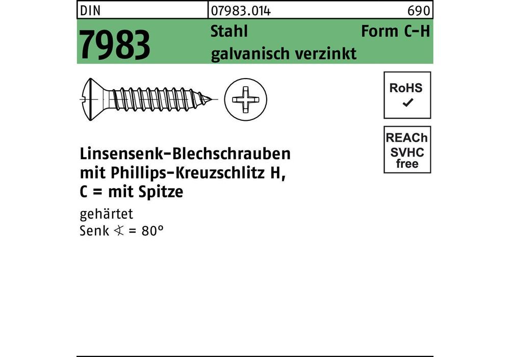DIN 7983 Stahl · geh. Form C-H galvanisch verzinkt Linsensenk-Blechschrauben mit Spitze · mit Phillips-Kreuzschlitz H - Abmessung: C 4,2 x 25 -H VE=K (100 Stück )Weitere technische Eigenschaften:
