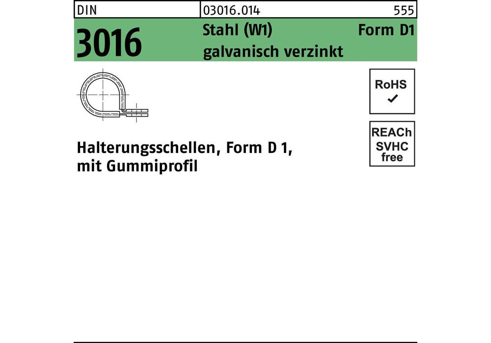 DIN 3016 Stahl (W1) Form D 1 galvanisch verzinkt Halterungsschellen · Form D 1 · mit Gummiprofil - Abmessung: 22 x 20 - W1 VE=S (50 Stück )Weitere technische Eigenschaften: