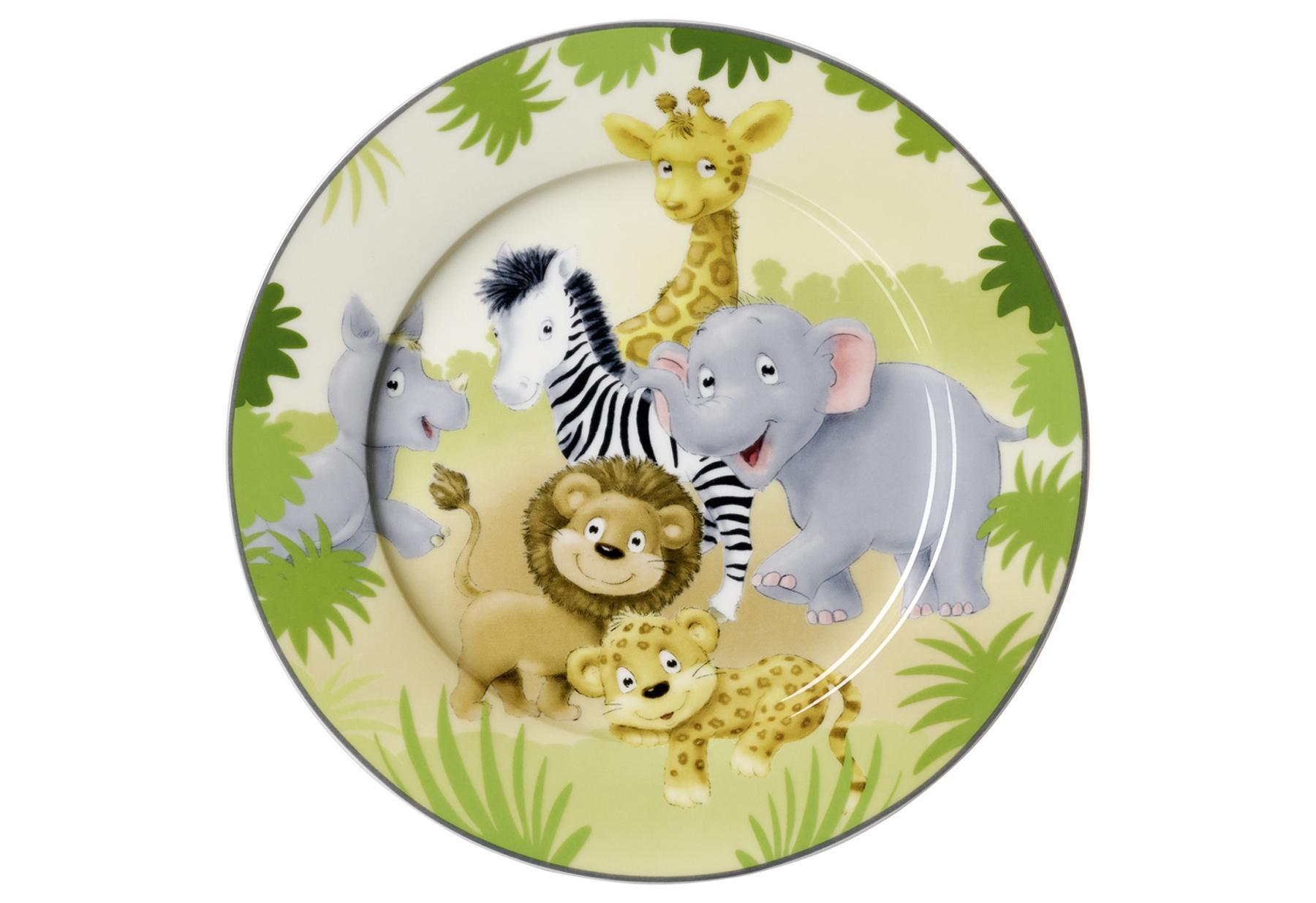 Frühstücksteller "Afrikatiere". Niki Nashorn hat seine Freunde zu einem kleinen Streifzug durch die Savanne zusammengetrommelt. Da sind die munteren Tierkinder Eli Elefant, Gilly Giraffe, Louie Löwe, Lenny Leopard und Zeki Zebra selbstverständlich mit von der Partie, denn sie möchten auf gar keinen Fall ein Abenteuer im Busch verpassen! Die niedliche Truppe leistet kleinen Leuten nette Gesellschaft bei den Mahlzeiten, damit diese sich nicht nur Pommes und Pasta, sondern auch Gemüse und Kartoffeln schmecken lassen. Hinweis zur Schale mit Griffen: Aus der flachen, breiten Schale können kleine Selberesser ihre Mahlzeiten bequem löffeln und sie dabei dank der praktischen Griffe gut festhalten. Als kleine Belohnung kommen nach dem Aufessen die fröhlichen Tiere am Boden zum Vorschein.Material: Porzellan, Inglasur. Maße: Ø 19 cm, H 2 cm. Spülmaschinenfest.Attribute