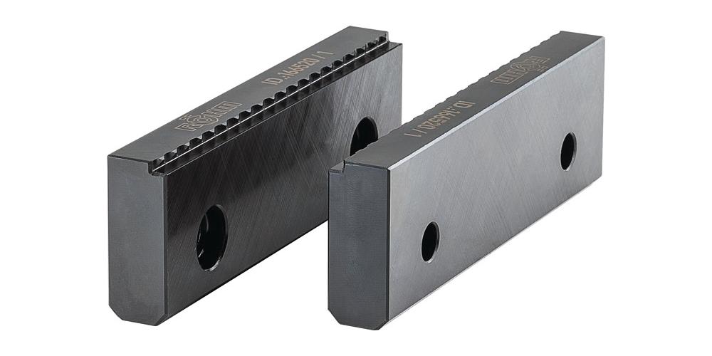 für NC-Kompaktspanner Modell RKE und TECWERK sowie Zentrischspanner RZM · einfache, sichere und formschlüssige Spannung von parallelen Roh- und Sägeteilen durch Eindringen der gehärteten Krallenspitzen · dadurch höhere Haltekräfte gegenüber Standardbacken · Möglichkeit der 5-Seiten-Bearbeitung in einer Aufspannung · für geringe Materialverluste und verkürzte Durchlaufzeiten und reduzierte Produktions- und Stückkosten · mit Feinstufe für Spanntiefe bis 2,5 mm