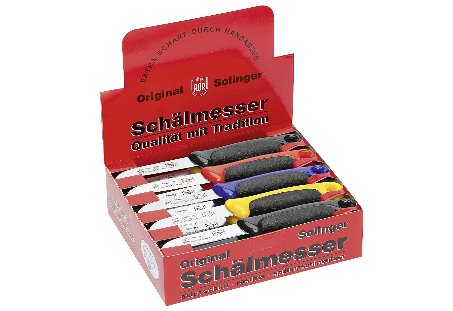 Küchenmesser „Bicolor“, Kunststoffgriff mit rutschfester Gummieinlage / Klinge Klingenstahl, rostfrei. Gesamtlänge L 17,5 cm, Klingenlänge: L 7,5 cm. Farbe: blau, gelb, rot, schwarz. Spülmaschinengeeignet. Wir empfehlen das Messer mit mildem Spülmittel unter fließendem Wasser zu reinigen und direkt abzutrocknen.Warnhinweise entnehmen Sie den Zusatzdokumenten