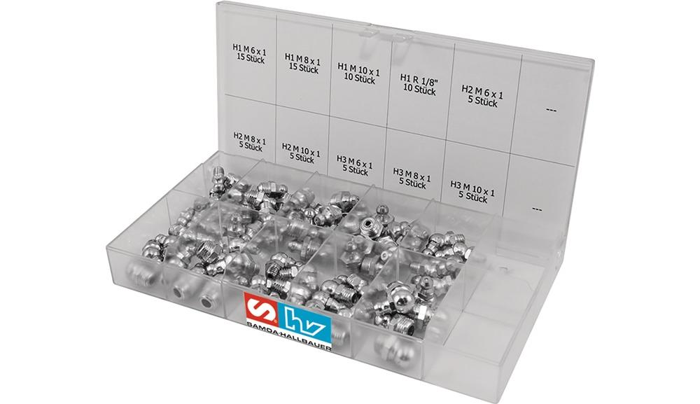Stahl, glanzverzinkt und passiviert · M6, M8, M10, 3 mm (R1/8″) · in Box · Inhalt: 15 St. H1 M6 x 1, 15 St. H1 M8 x 1, 10 St. M10 x 1, 10 St. H1 R1/8, 5 St. H2 M6 x 1, 5 St. H2 M8 x 1, 5 St. H2 M10 x 1, 5 St. H3 M6 x 1, 5 St. H3 M8 x 1, 5 St. H3 M10 x 1Attribute
