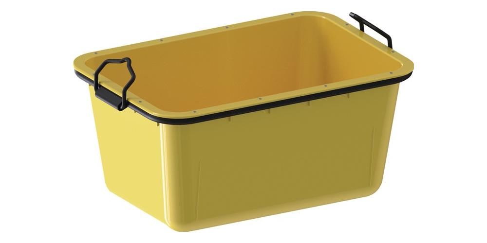 Mörtelwanne aus Kunststoff in gelb, mit Stahlrohrr aus robustem und schlagzähem HDPE (High Density Polyethylen) mit hoherDichte UV-stabilisiert, für den Transport von Mörtel und anderen Materialien