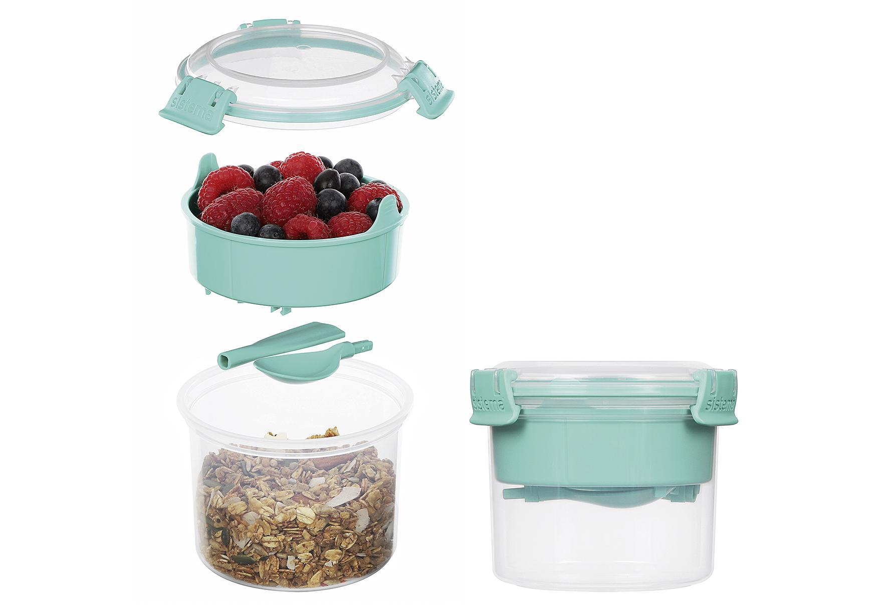 farblich sortiert, dank der einfach zu verschließenden Clips und gummierten Dichtungen bleiben Lebensmittel länger frisch, die praktische Einsatzschale eignet sich z.B. ideal für Joghurt und Obst, der Löffel lässt sich bequem im Boden des Einsatzes verstauen, Cerealien werden separat transportiert, bleiben knusprig bis zum Verzehr, gefriergeeignet, spülmaschinen- und mikrowellenfest, Gummi (rausnehmbar) aus Thermoplastischen Elastomeren (TPE), Deckel/Unterteil Kunststoff Polypropylen (PP)Attribute