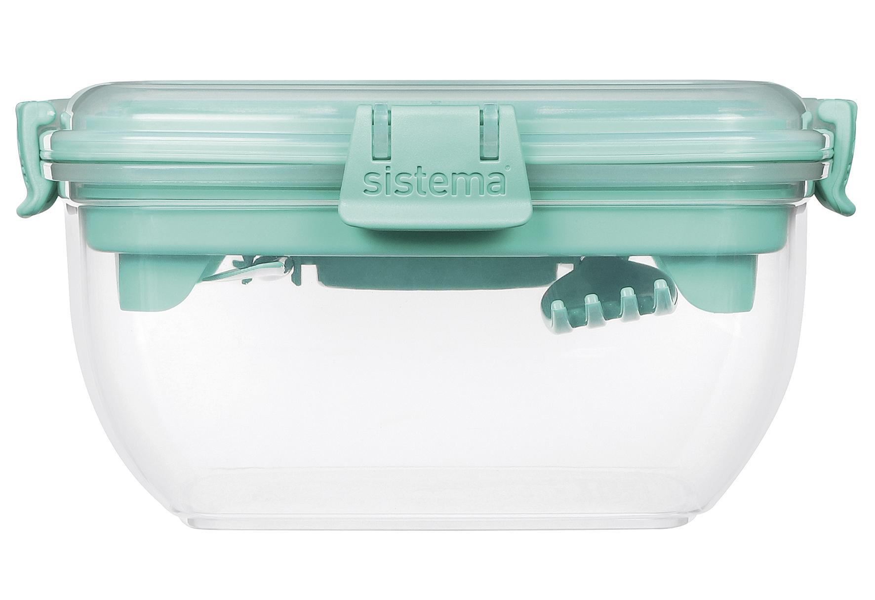 Die 16,5 x 16,5 x 8,5 cm große Salatbox mit einer Füllmenge von 1,1 L von SISTEMA bietet Ihnen den idealen Behälter zum Mixen oder Aufbewahren von Salat. Sie besitzt verschiedene Gummidichtungen und Clips und sogar einen separaten Dressinghalter. Messer und Gabel lassen sich kinderleicht im aus Polypropylen bestehenden Boden verstauen. Der Deckel ist ebenfalls aus Polypropylen hergestellt. Farben: Minty Teal / Misty Purple / Ocean BlueLieferumfang: