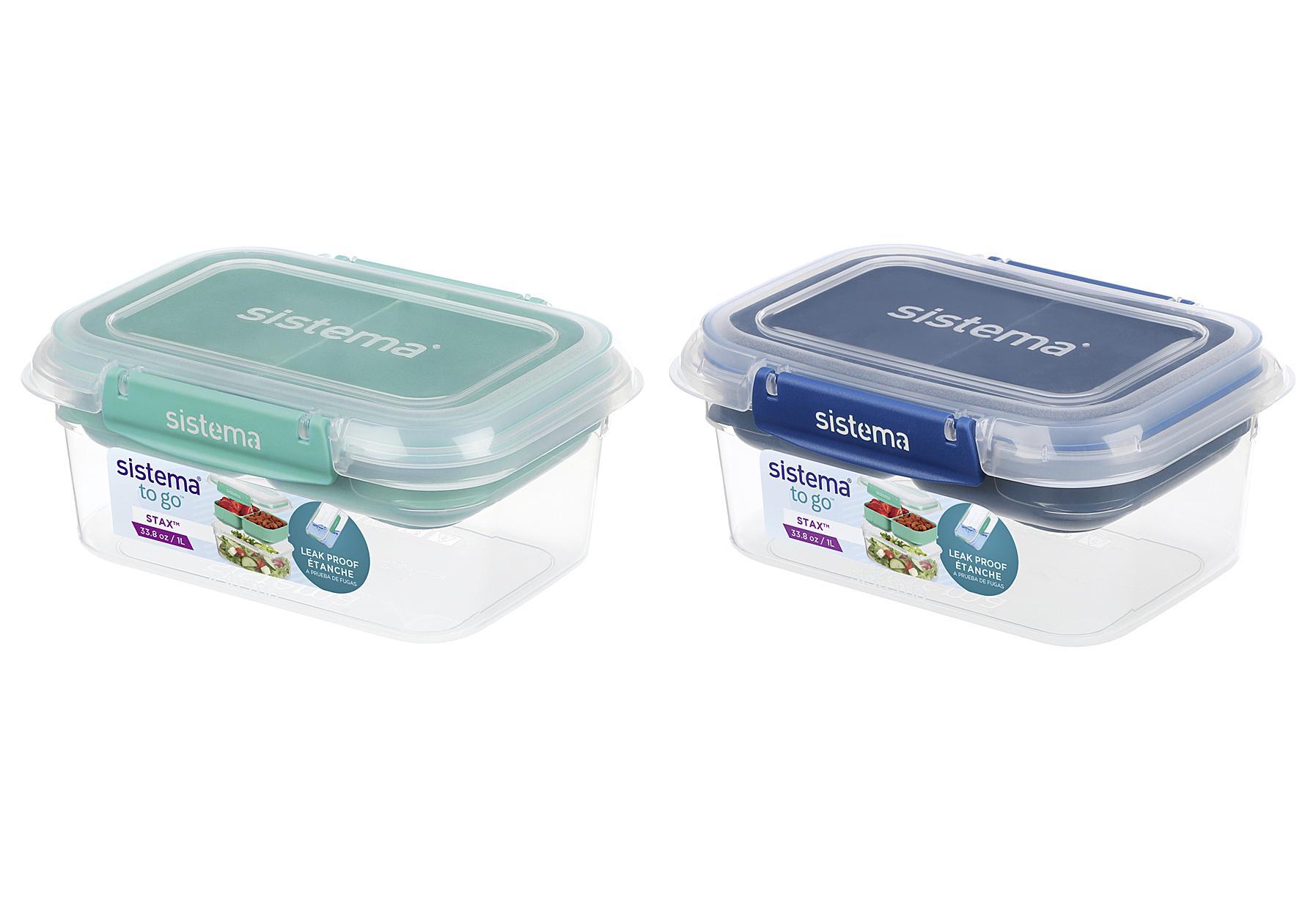 Sistema® TO GO™ Stax™ 1L Auslaufsicherer Lunch und Snackbehälter mit sicherem Deckel und 2-Fach-Schale. Der 100% auslaufsichere und luftdichte Deckel bedeutet, dass Sie Ihr Essen mit zur Arbeit, in die Schule oder an einen anderen Ort nehmen können, ohne sich Sorgen machen zu müssen, dass es in Ihrer Tasche ausläuft. Hergestellt mit den für Sistema typischen, leicht verschließbaren Clips und Dichtungen, die Ihre Lebensmittel länger frisch halten und gleichzeitig zusätzliche Sicherheit bieten. Der Behälter im Stil einer Bento-Box mit herausnehmbarem Tablett mit zwei Fächern sorgt dafür, dass Ihre Lebensmittel getrennt bleiben - ein unverzichtbares Merkmal beim Packen von Lunchpaketen für Kinder und wählerische Esser. Behälter, Schalen und Deckel sind stapelbar und lassen sich leicht ineinander stecken, so dass die Aufbewahrung und Organisation ein Kinderspiel ist. Hergestellt in Neuseeland aus langlebigen, lebensmittelechten Materialien, BPA-frei, gefrierschrank- und mikrowellengeeignet sowie spülmaschinenfest. Abgerundete Ecken an Schale und Behälter erleichtern Kindern das Herausschöpfen von Lebensmitteln und Erwachsenen die Reinigung. Die rechteckige Größe von 1 Liter ist perfekt für Mittagessen und Snacks.Attribute