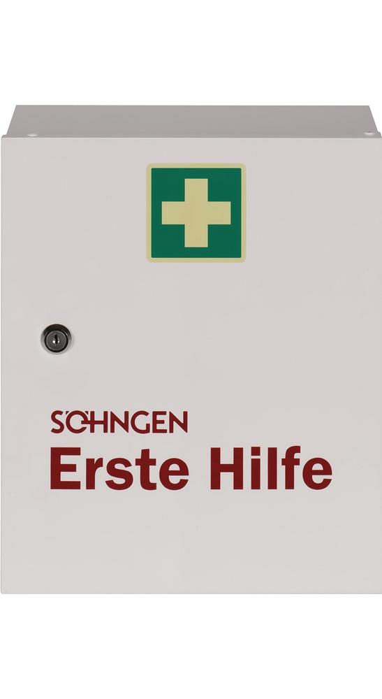 Füllung nach DIN 13157 · Verbandstoff-Füllung verfügt über sehr hochwertige Verbandstoffe auf Basis des aluderm®, aluderm®-aluplast, SIRIUS®-Rettungsdecke sowie über eine zusätzliche Beatmungsmaske · aus Stahlblech · weiss · 1-türig · Sicherheitsschloss · 2 Schlüssel · klappbares Ablagetableau · 1 EinlegebodenWeitere technische Eigenschaften:
