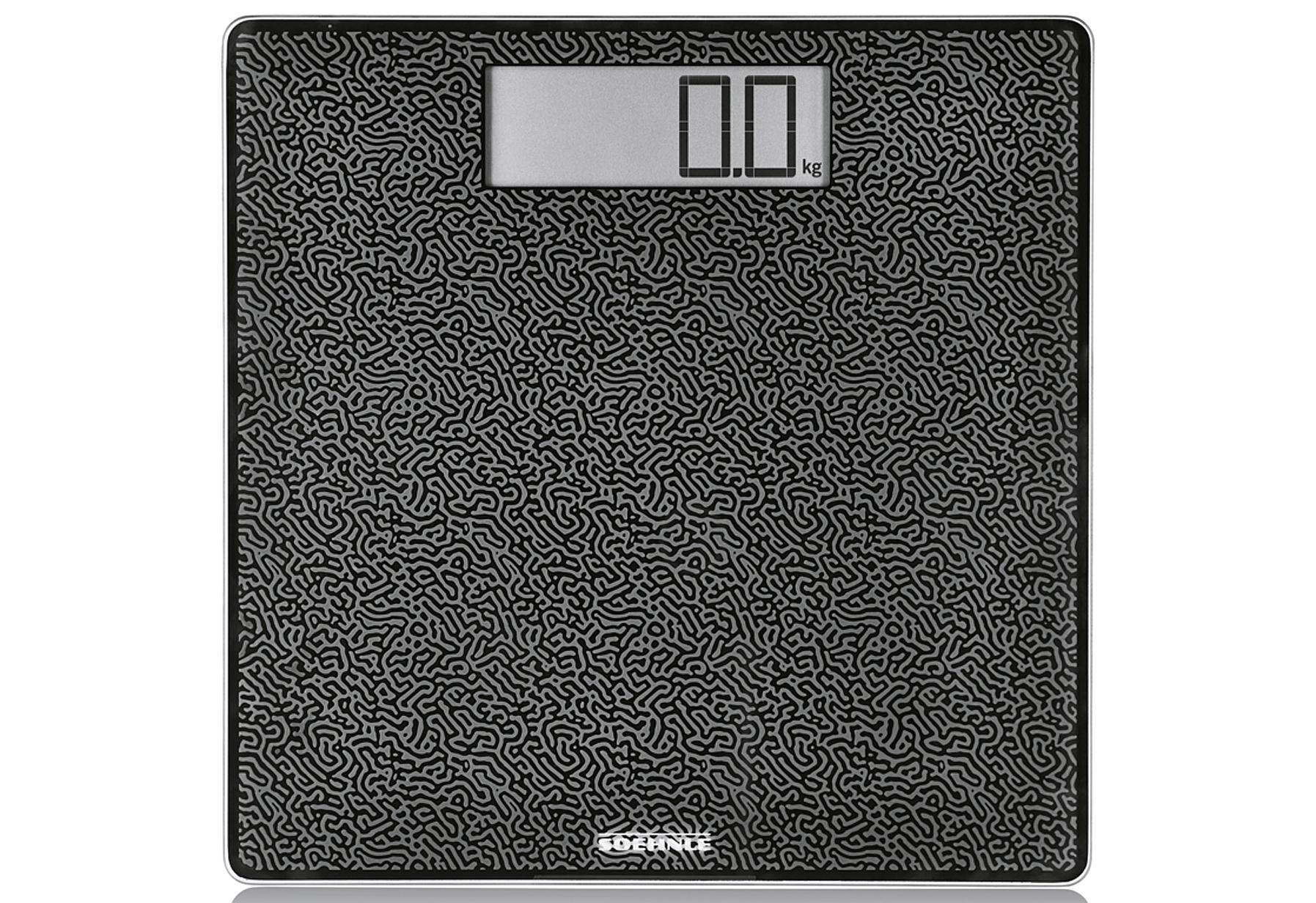 SOEHNLE Personenwaage "Style Sense Comfort Coral" bis 180 kg, schwarz. Hochwertig mattiertes Glas in exklusivem Coral Design. Großformatige LCD-Anzeige (3,5 cm) und rutschhemmende Oberfläche. Maximale Belastbarkeit bis zu 180 kg Körpergewicht. Quadratische Trittfläche in großem Format für stabiles Wiegen (31 x 31 cm). Sicherer Stand durch rutschfeste Füße. (LxBxH): 35x34,5x3,5 cm.Achtung! Rutschgefahr bei nasser Oberfläche. Achtung! Stolpergefahr. Dieses Gerät darf von Kindern ab 8 Jahren sowie von Personen mit eingeschränkten physischen, sensorischen oder mentalen Fähigkeiten oder Mangel an Erfahrung und Wissen benutzt werden, wenn sie beaufsichtigt oder bezüglich des sicheren Gebrauchs des Geräts unterwiesen wurden und die daraus resultierenden Gefahren verstehen. Reinigung und Benutzerwartung darf nicht von Kindern ohne Beaufsichtigung durchgeführt werden. Kinder dürfen nicht mit dem Gerät spielen.Nicht geeignet für Personen mit elektronischen Implantaten (z.B. Herzschrittmacher).Verwenden Sie keine aggressiven Reinigungsmittel! Üben Sie keinen Druck auf das Gerät aus und lassen Sie es nicht fallen.