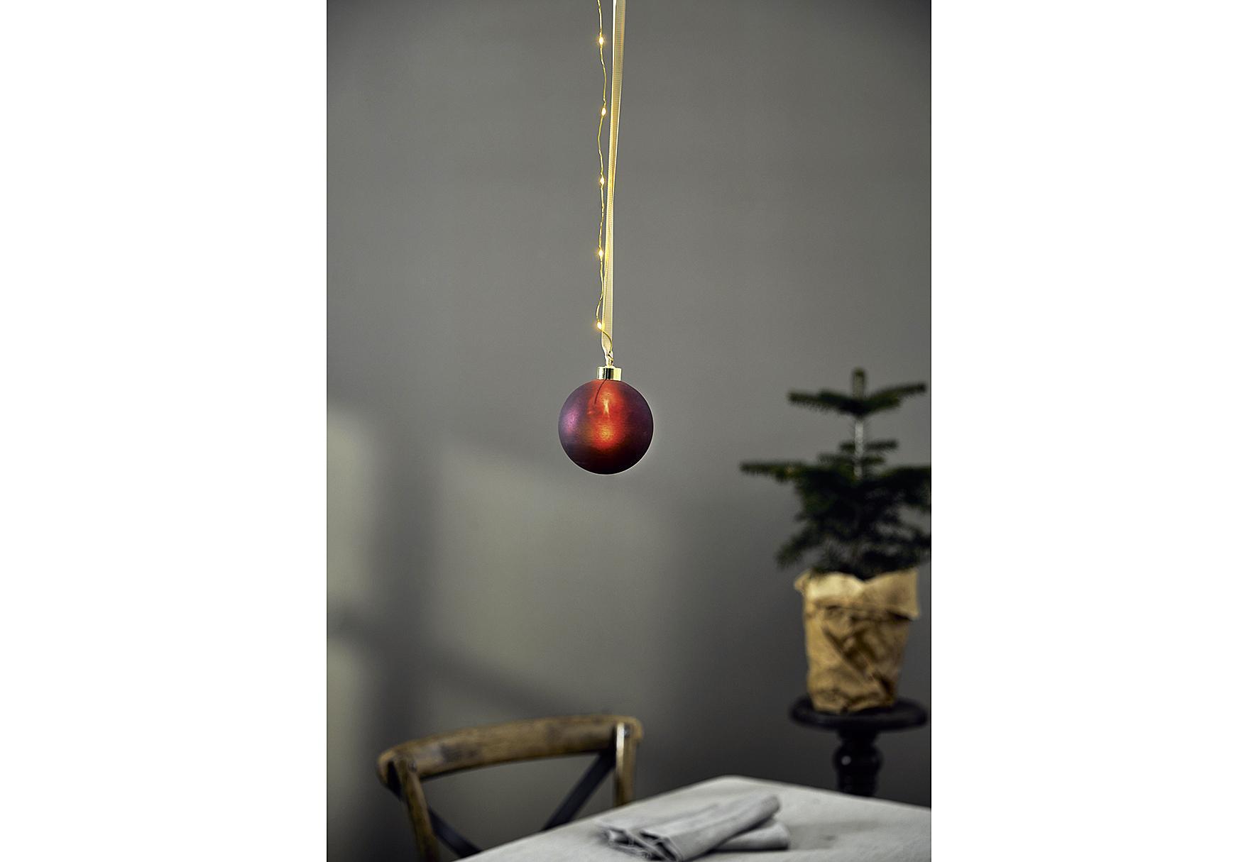 Glaskugel "Bliss" rot, Ø ca. 10 cm, H 11 cm, insgesamt 16 warmweiße LEDs, 3 LEDs in Kugel, 13 LEDs im 2 m Band, batteriebetrieben (3 x AA erforderlich, nicht enthalten), mit Timer.Nur für den Innenbereich geeignet.