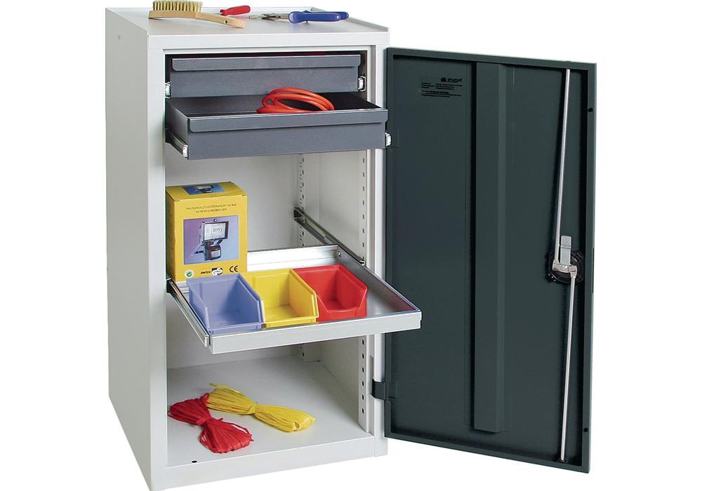Stahlblechkonstruktion mit widerstandsfähiger Pulverbeschichtung · ausgestattet mit Schubladen und herausziehbaren Fachböden, mit allseitigem Rand, Höhe 30 mm, auf kugelgelagerten Präzisionsauszügen, 100 % ausziehbar · Schubladen, H 100 mm und Fachböden im 25-mm-Raster höhenverstellbar · Tragfähigkeit pro Fachboden/Schublade 35 kg · obere Ablage mit Abrollrand · Flügeltür abschließbar mit Zylinderschloss und Drehriegelverschluss mit 3-Punkt-VerriegelungLieferung ohne Inhalt