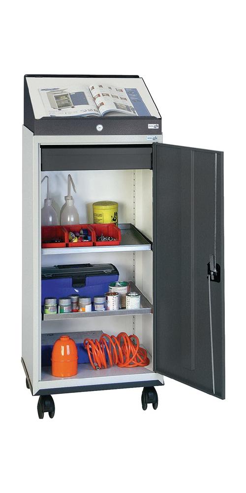 Stahlblechkonstruktion mit widerstandsfähiger Pulverbeschichtung · bestehend aus 1 Werkzeugschrank H 1000 x B 500 x T 500 mm mit 1 Schublade H 100 mm und 2 Fachböden, mit allseitigem Rand, Höhe 30 mm (lt. UVV nicht ausziehbar) · Schreibpultaufsatz mit abschließbarerem Deckel · Rollenuntersatz mit 4 Lenkrollen Ø 75 mm, Tragfähigkeit 75 kg pro Rolle · Schubladen, H 100 mm und Fachböden im 25-mm-Raster höhenverstellbar · Tragfähigkeit pro Fachboden/Schublade 35 kg · Flügeltür abschließbar mit Zylinderschloss und Drehriegelverschluss mit 3-Punkt-Verriegelung