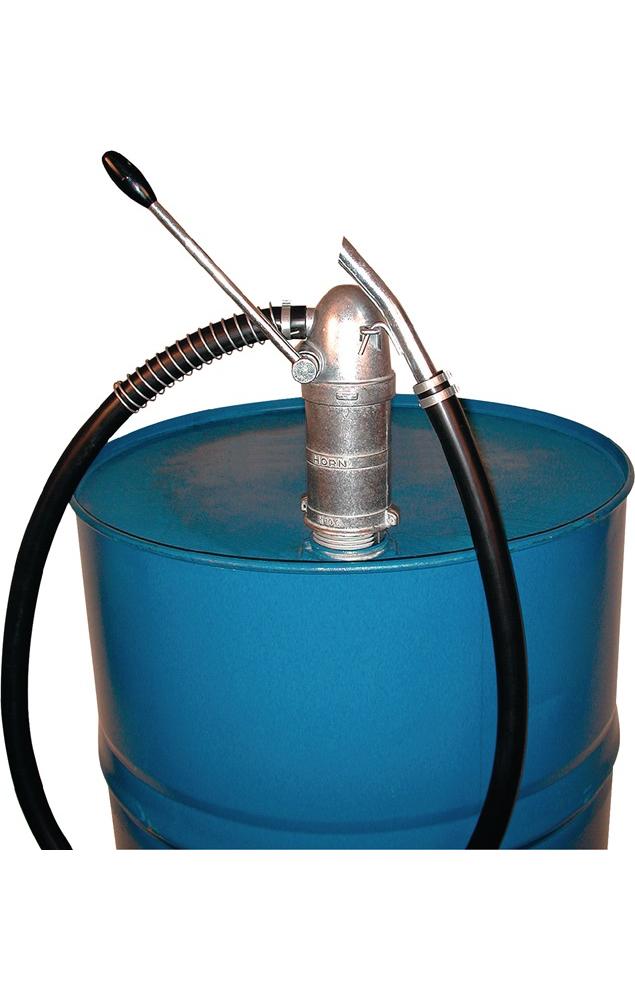 aus Metall (Zinkdruckguss) · für Diesel, Heizöl EL/L, Kraftstoffe, Petroleum (Gefahrklasse A I-II), Kühlerfrostschutzmittel (unverdünnt) und dünnflüssige Mineralöle · Teleskop-Saugrohr, Saugrohrlänge 470-925 mm · Förderleistung: 0,25 l/Hub · Fassverschraubung M 64 x 4/ 50,80 mm (2″) · komplett mit Schlauchgarnitur 1500 mm lang DN 19, elektrisch leitfähig · einfachwirkendAttribute