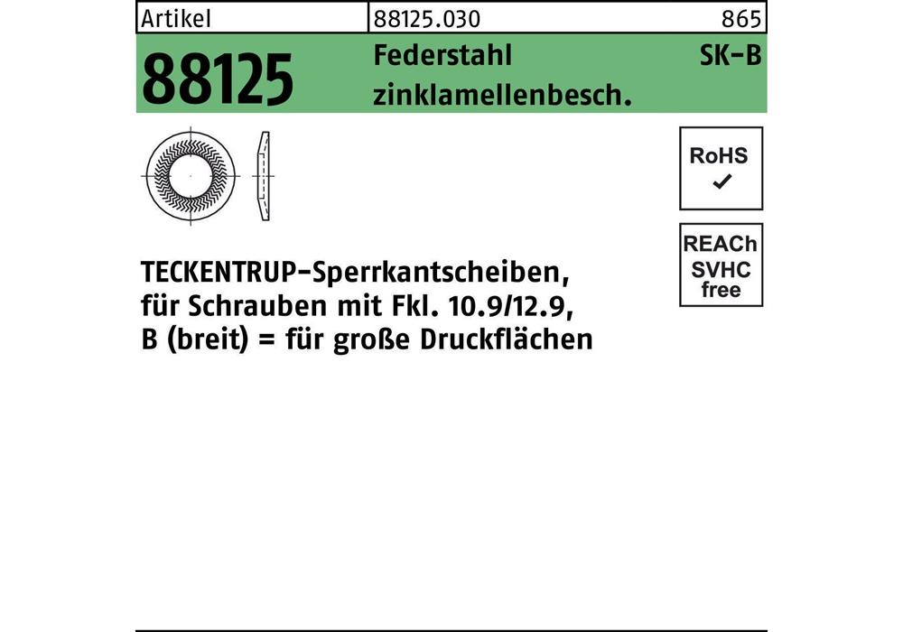 Artikel 88125 Federstahl Form B zinklamellenbesch. TECKENTRUP-Sperrkantscheiben für Fkl. 10.9/12.9 · für große Druckfl. - Abmessung: B 8x22,25x1,9 VE=S (1000 Stück )Weitere technische Eigenschaften: