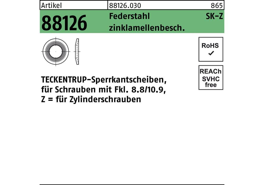 Artikel 88126 Federstahl Form Z zinklamellenbesch. TECKENTRUP-Sperrkantscheiben für Zyl.-Schrauben mit Fkl. 8.8/10.9 - Abmessung: Z 6x 9,9x1,4 VE=S (1000 Stück )Weitere technische Eigenschaften: