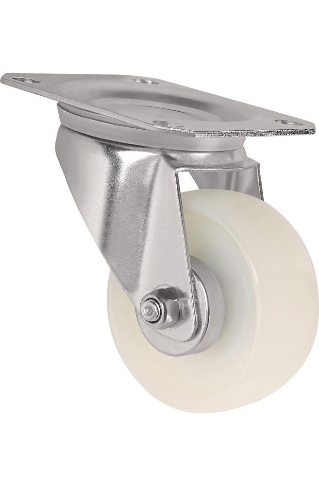 Transportgeräterolle · galvanisch blau verzinktes Stahlblechgehäuse mit Vollniet-Plattenbefestigung · zweireihiger Kugelkranz im Gabelkopf · Radachse verschraubt · Rollenlager · Rad aus Polyamid, weiß, mit kleinem Metallfadenschutz, witterungsbeständig, beständig gegen viele Öle und Chemikalien · mit PlattenbefestigungWeitere technische Eigenschaften: