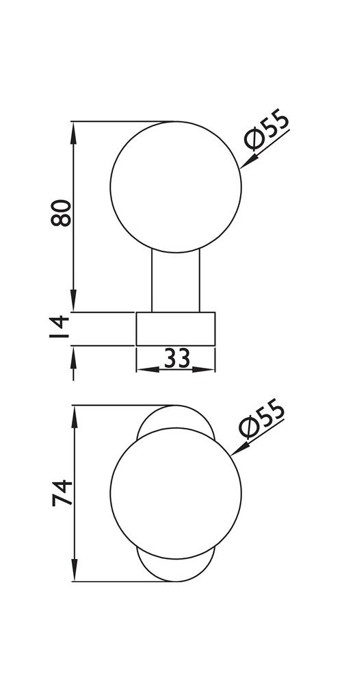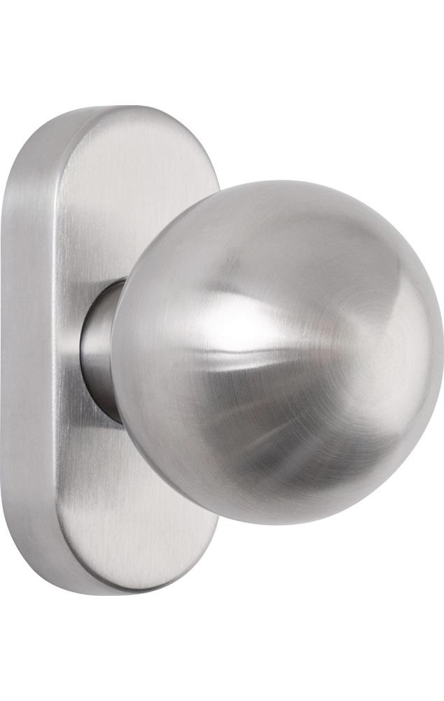 Kugeltürknopf · gekröpft · fest oder drehbar auf Ovalrosette · Schraublochung 6 mm · Knopflochteil mit 8 mm Vierkantlochung · Knopf fest montiert mit M12 Innengewinde für den Einsatz von Standard-Wechselstiften mit Rolle · Die Version „fest“ ist auch für Brandschutztüren zugelassen.Weitere technische Eigenschaften: