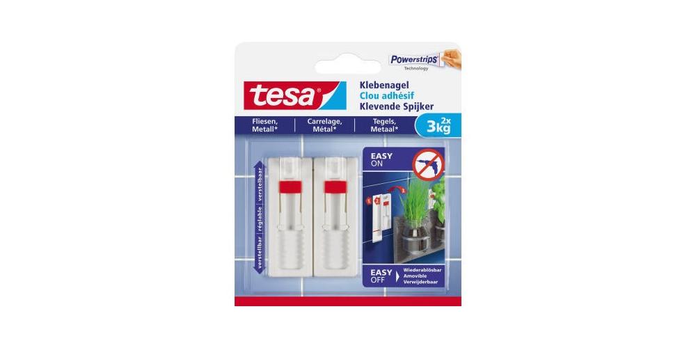 Der innovative Klebenagel von tesa® hält nicht nur auf empfindlichen Untergründen, sondern ist auch in seiner Höhe verstellbar. Dadurch lassen sich Objekte sicher aufhängen und optimal gerade ausrichten. Für die Nutzung des Klebenagels als Alternative zu "normalen" Nägeln oder Schrauben sprechen viele Gründe. Man benötigt kein Werkzeug, hinterlässt keine Spuren und vermeidet Beschädigungen am Untergrund. Außerdem lässt sich der Klebenagel mit einem passenden Klebestreifen einfach wiederverwenden.Attribute