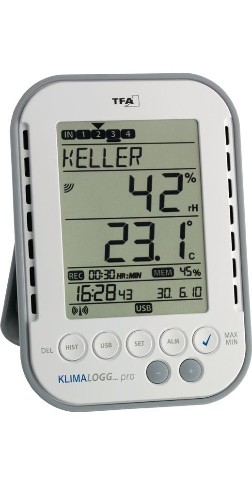 mit Datenlogger-Funktion zur Überwachung von Temperatur (0 °C bis +50 °C, Genauigkeit ± 1°C) und Feuchte (1 % bis 99 %, Genauigkeit ± 3% von 35 % bis 75 %) · Anzeige von Taupunkt, Höchst- und Tiefstwerte mit Zeit und Datum der Speicherung · Alarm bei Unter-/Überschreitung von frei einstellbaren Temperatur- und Feuchtewerten · Alarmevent-Funktion · Datenlogger mit bis zu 50.000 Datensätzen · abrufbar über Display oder am PC mit USB Schnittstelle · Schaltausgang · Funkuhr mit Sekunden, Datum, Zeitzone, ±12 Std. · umstellbar °C/°F · inkl. Batterie 3 x 1,5 V AA, PC-Software und USB-Transceiver · Anschluss von bis zu 8 Thermo-Hygro-Funkaußensendern optional (nicht inklusive)Weitere technische Eigenschaften: