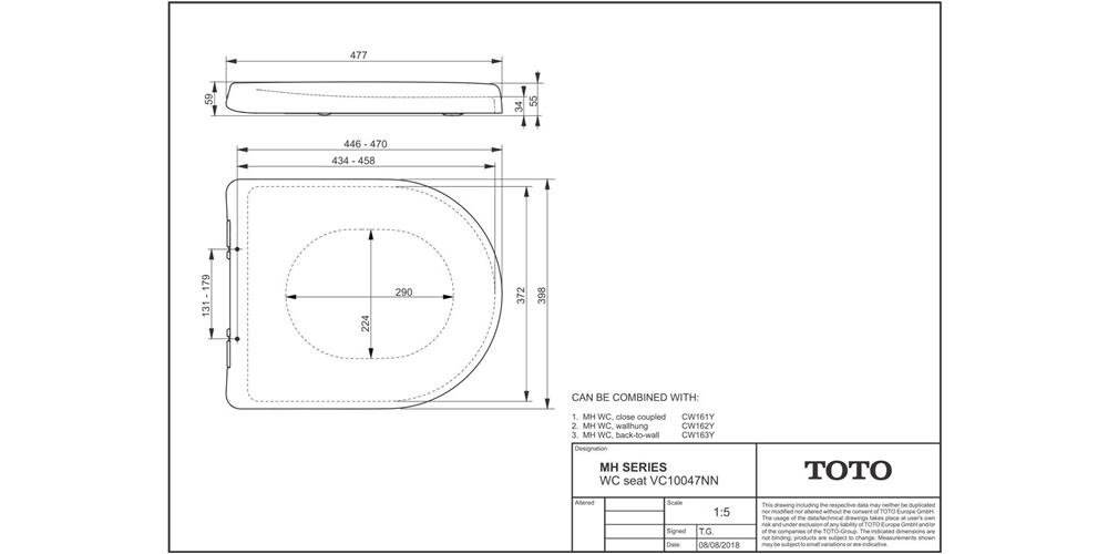 TOTO WC-Sitz MH · abnehmbar · mit Absenkautomatik · mit Edelstahlscharnieren Artikelnummer: VC10047NN Maße in mm (BxTxH): 398 x 477 x 59 Material: Ureaharz Farbe: weiß Gewicht: 3,96 kg Norm: DIN 19516 Ausführung: Deckel greift über den Sitzring · abnehmbar · mit Absenkautomatik und Edelstahlscharnieren Montage: Befestigung von oben Im Lieferumfang: Befestigungssatz kombinierbar mit WC MH · wandhängend (CW162) · WC MH · Back-to-Wall · bodenstehend (CW163Y) oder WC MH · Standkombination (CW161)Weitere technische Eigenschaften:
