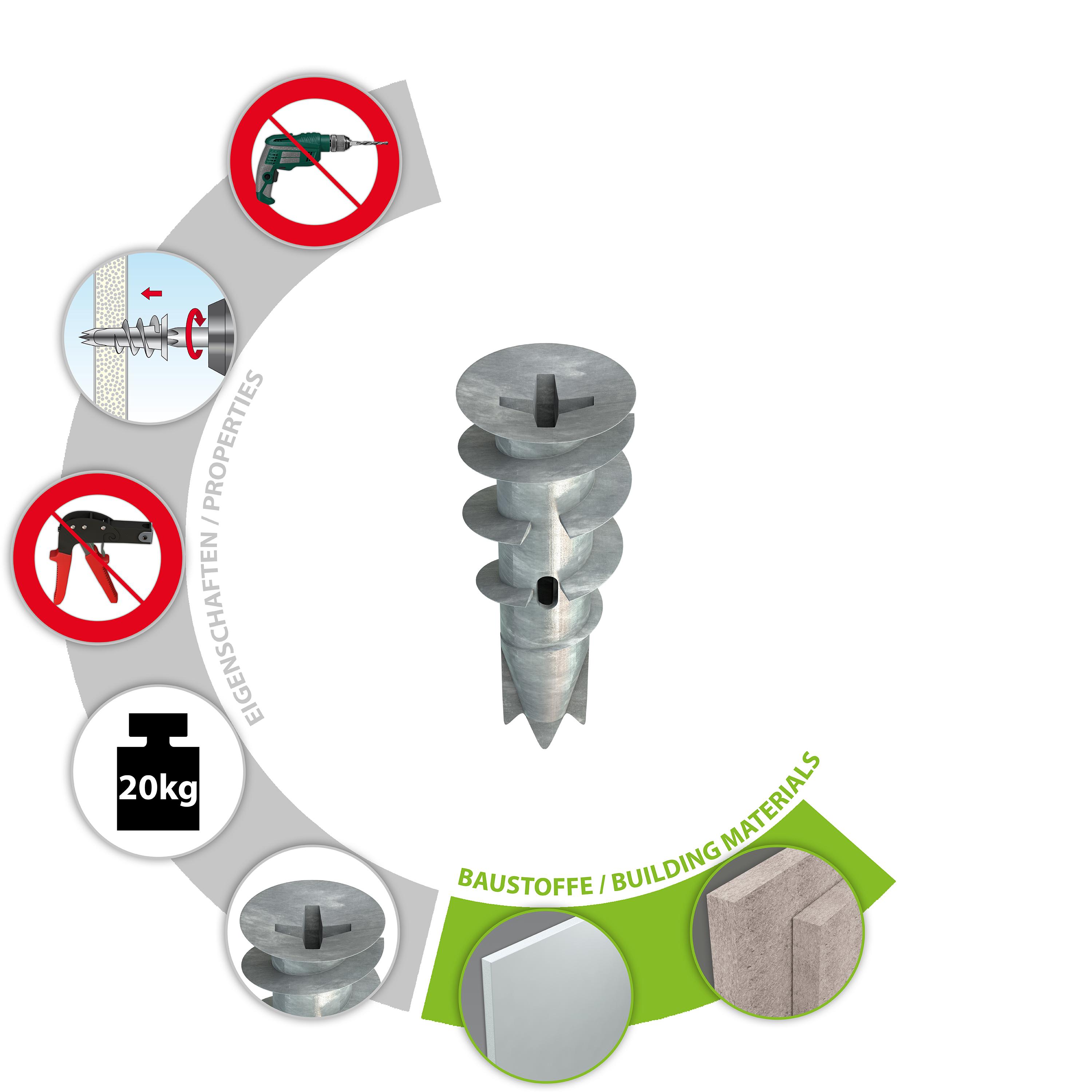 - Metalldübel (Zinkdruckguss) mit Bohrspitze und ausgeprägtem Außengewinde