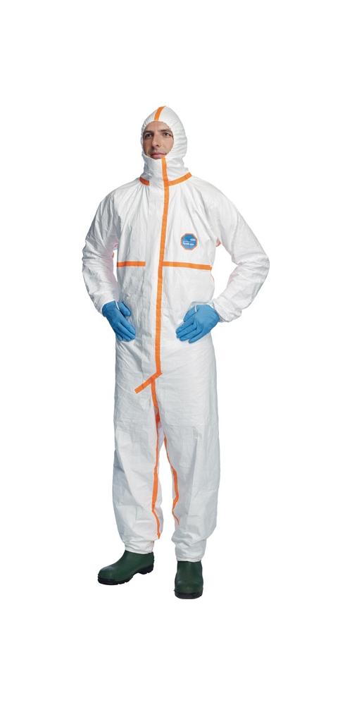 EN 14126, EN 1073-2, EN 1149-5 (auf der Innenseite), Kat. III, Typ 3 B, 4 B, 5 B + 6 Bmit Kapuze · überklebte Nähte, orange · Daumenschlaufen · Gummizüge an Ärmel- und Beinenden und Kapuze · eingeklebter Gummizug im Rückenbereich · Tyvek® Reißverschluss · selbstklebende Reißverschluss- und Kinnabdeckung · Anwendungsgebiete: Hochdruckreiniger-Arbeiten, Umgang mit Ölen und Fetten, Kanalarbeiten, Schutz vor niedrig konzentrierten anorganischen Chemikalien