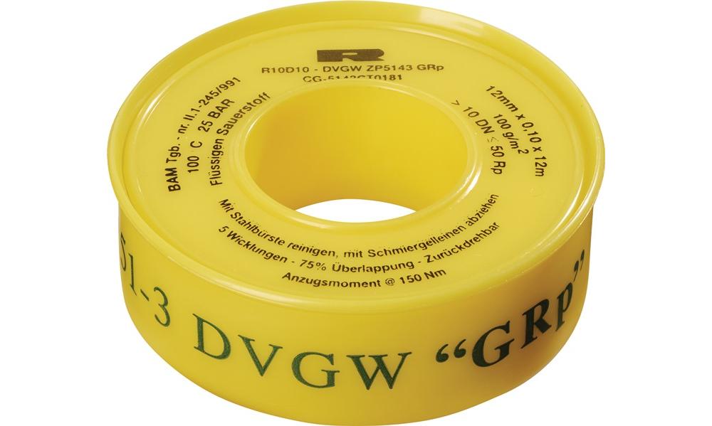 zur problemlosen Abdichtung für nahezu alle Gewindearten und Medien · nach DIN EN 751-3 geprüft · beständig gegen nahezu alle Chemikalien · versprödet, quillt und klebt nicht · schnelle und saubere Verarbeitung · unbrennbar · lebensmittelecht · mit 50 % Überlappung auf das Gewinde gewickelt · Anwendungsbereich Überdruck Temperatur