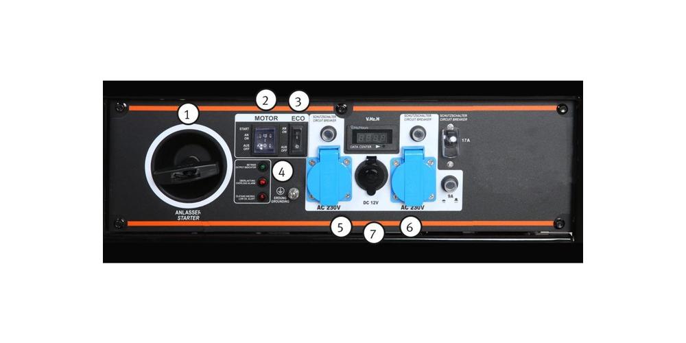 Invertertechnik für konstante Leistung · für Heim und Garten, Camping, Wohnwagene, Boote, Computer und andere empfindliche elektronische Geräte · Eco Modus regelt die Drehzahl je nach Stromverbrauch · Choke für problemlosen Kaltstart · Kontrollleuchten für Ausgangsspannung, Überlastung und Ölmangel · Überlastschutz durch Thermoschutzschalter ·Weitere technische Eigenschaften: