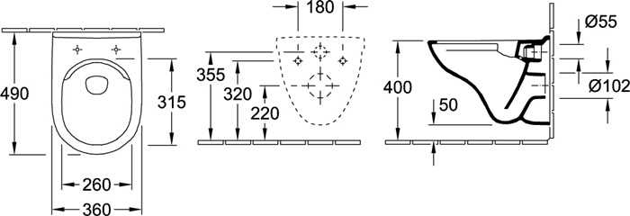 Villeroy & Boch O.novo · Combi·Pack · DirectFlush · Sanitärkeramik · Maße: 360 x 490 mm · Oval · wandhängend · nicht für den Einbau mit Druckspülern geeignet · Spülwasserbedarf: 3 / 4,5 l · EN 997 · Abgang waagerecht · im Lieferumfang: 1 x Tiefspül·WC · 1 x WC·Sitz · Einzel·Kartonverpackung · 01 Weiß AlpinWeitere technische Eigenschaften: