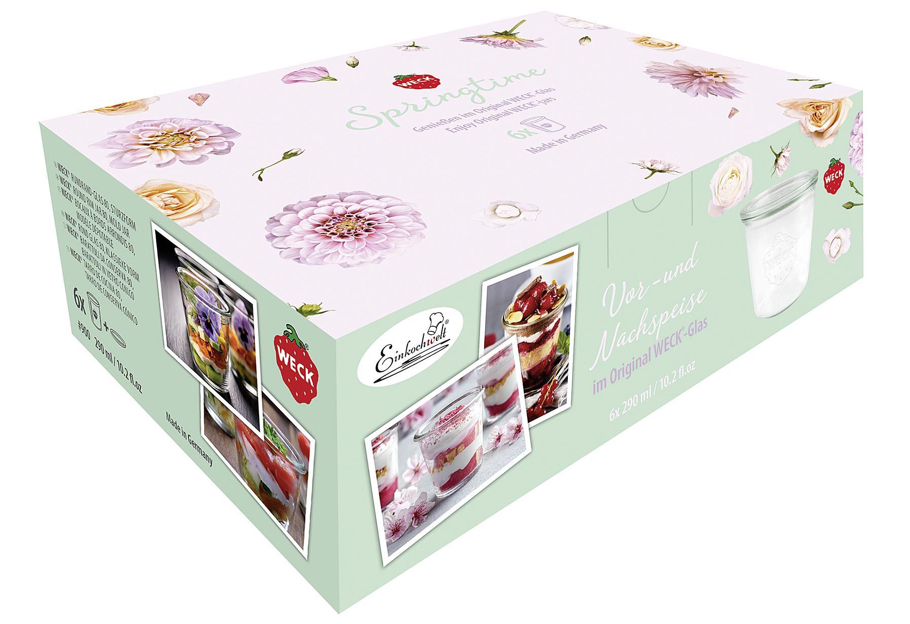 6er Karton 290 ml Weck-Gläser Sturzform m. Deckel im illustrierem Karton "Frühlingserwachen". Inhalt: 6 Gläser einschließlich Glasdeckel 80 mm. Abmessungen: Höhe: 87 mm, Öffnung: Ø 80 mm, Inhalt: 290 ml.Lieferumfang: