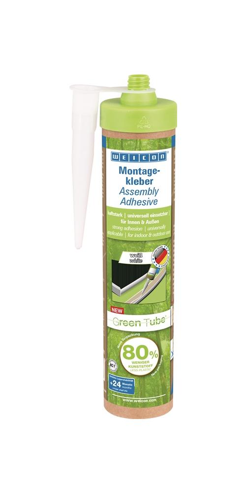 haftstarker, universell einsetzbarer Dispersions-Acryl-Klebstoff für Montage-, Reparatur- und Ausbesserungsarbeiten im Innen- und Außenbereich · hohe Anfangshaftung und Endfestigkeit · härtet schnell aus · nach Trocknung schleif- und überputzbar · überstreichbar · ideal für flächige Verklebung von Holzwerkstoffen (Sockelleisten, Paneele, Spanplatten), PVC, Styropor®, Polystyrolschaumplatten, PU-Hartschaum (Dämmplatten, Kabelkanäle etc.), mineralischen Werkstoffen (z.B. Fliesen) und Metallen auf saugenden Untergründen, wie Putz, Beton, Faserzement etc. · emissionsarm · lösemittelfrei · Temperaturbeständigkeit: -20 °C bis +80 °CNEU: in der Green Tube®, die nachhaltige Verpackung als Alternative zur Plastikkartusche - insgesamt 80% weniger Kunststoff: Kartuschenkörper 100% aus Papier, Montagekleber im Alu-Schlauchbeutel, der Deckel aus Bio-Polymer und die Kartuschenspitze aus 100% recyceltem Kunststoff