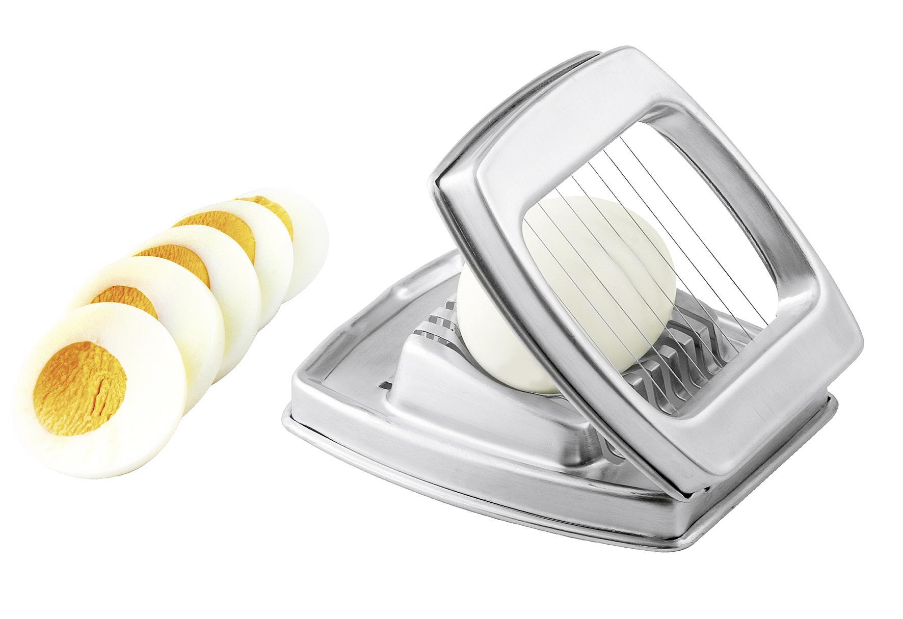 Der Eierschneider aus dem Hause Karl Weis ist komplett aus hochwertigem, rostfreiem Edelstahl in satinierter Ausführung geeignet. Die 8 gespannten Edelstahl-Drähte eignen sich perfekt zum Schneiden von Eiern in 8 gleichmäßige Scheiben mit einer Dicke von ca. 5 mm. Der Eierschneider ist durch seine stabile Bauweise besonders langlebig. Das Produkt ist leicht zu reinigen und spülmaschinenfest. Maße: (LxBxH): 10,4x8,6x3,2 cm.Attribute