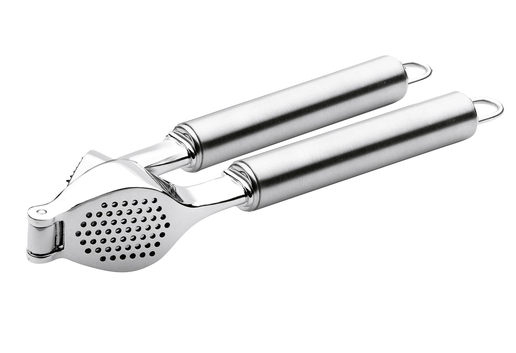 Die Knoblauchpresse aus dem Hause Karl Weis liegt gut in der Hand ermöglicht ein einfaches und komfortables Pressen. Durch einmaliges Umdrehen können die Reste mittels eines integrierten Reinigungskammes schnell entfernt werden. Die Knoblauchpresse ist für einen langlebigen Einsatz konzipiert und daher in stabiler und massiv Ausführung gefertigt. Die hochwertigen Edelstahlgriffe verfügen über eine Öse, daher kann die Aufbewahrung auch dekorativ an einer Küchenleiste erfolgen. Die Reinigung sollte mit etwas Spülmittel unter fließendem Wasser erfolgen, das Produkt ist nicht spülmaschinengeeignet. Maße: (LxBxH): 20x6x4 cm.Attribute