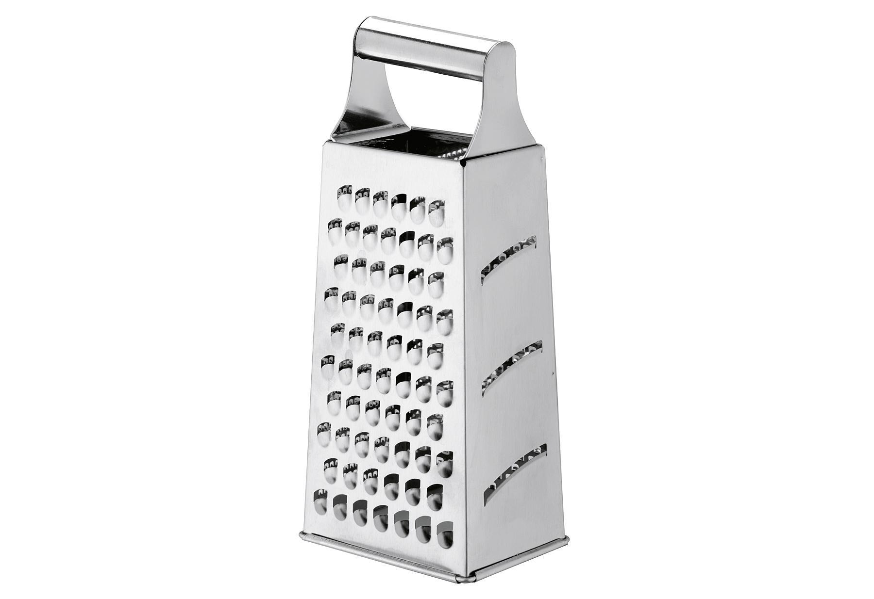 Die Vierkantreibe ist aus hochwertigem Edelstahl gefertigt und verfügt über 3 ultrascharfe Reibflächen sowie einen dreifachen Hobel. Die Reibe ist perfekt für vielerlei Obst- und Gemüsesorten wie z.B. Kartoffeln, Gurken, Karotten, Zwiebeln, Zitrusfrüchte aber auch für Hartkäse, Schokolade, Muskat und mehr geeignet. Die hochwertigen Reibflächen aus rostfreiem Edelstahl schneiden das Reibgut perfekt und verfügen über eine langanhaltende Schärfe. Durch den ergonomischen Rohrgriff kann die Reibe jederzeit sicher und komfortabel gehalten werden. Die Vierkantreibe ist in einer stabilen Ausführung gefertigt, äußerst langlebig und sowohl für den Privaten- als auch den Professionellen Einsatz im Gastronomiegewerbe geeignet. Die Vierkantreibe ist spülmaschinengeeignet, für eine langhaltende Schärfe wird jedoch die Reinigung von Hand empfohlen.Attribute