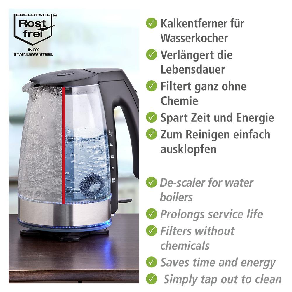 Verkalkte Wasserkocher oder Kessel verbrauchen unnötig viel Strom. Zusätzlich verkürzt Kalk die Lebensdauer der Geräte. Damit es gar nicht erst soweit kommt, filtert der Kalkfänger Hexi den Kalk aus dem Wasser heraus, ganz ohne Chemie. Einfach den Edelstahlring in den Wasserkocher oder den Kessel legen und mit aufkochen. Mit jeder Benutzung lagert sich der Kalk nun an den Edelstahlmaschen ab und nicht an den Wänden des Gerätes. So spart man Zeit und Energie. Die Reinigung des Kalkfängers Hexi ist durch gelegentliches Ausklopfen leicht zu erledigen.Attribute