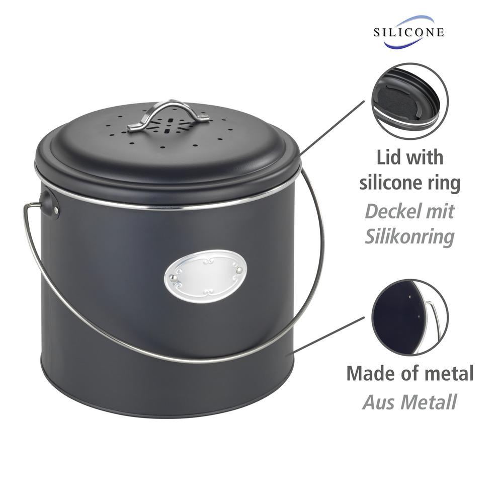 Beim Grillen und Kochen fallen meistens auch jede Menge Küchenabfälle an: Der dekorative Komposteimer Nero 6L von WENKO sorgt dafür, dass nützliche Bioabfälle bereits in der Küche hygienisch vom Hausmüll getrennt und kurzzeitig zwischengelagert werden können. Dank des praktischen Deckels mit auswechselbarem Aktivkohlefilter werden unangenehme Gerüche direkt neutralisiert und lästige Fruchtfliegen ferngehalten. 3 zusätzliche Aktivkohlefilter sind bereits im Lieferumfang enthalten. Die zusätzlichen Luftlöcher im Deckel sorgen für eine effektive Belüftung im Inneren des Eimers und vermeiden, dass die Küchenabfälle vorzeitig gären. Sollte doch mal etwas auslaufen, kann der Behälter ganz leicht mit einem feuchten Tuch ausgewischt werden. Der elegante Eimer hat ein Fassungsvermögen von 6 Litern und bietet mit einer Größe von (B/T x H): Ø 22,5 x 22,5 cm ausreichend Platz für den Biomüll ohne dabei wuchtig zu wirken. Tragen lässt er sich bequem am Henkel. Das pulverbeschichtete Metall in mattem Schwarz macht den nützlichen Biomüll-Sammler zu einem attraktiven Hingucker in jeder Küche. Das besonders ansprechende Retro-Design zaubert nostalgischen Charme in jede Küche! Ein beschreibbares Metallschild trägt dazu bei, dass der Eimer nicht versehentlich zweckentfremdet wird. Die Behälter der Serie Nero von WENKO sind die idealen Küchenhelfer: Sie schaffen Ordnung in Küche oder Vorratskammer und sind gleichzeitig dekorative Accessoires, die Ihrer Küche mühelos einen individuellen Touch verleihen.Eigenschaften: