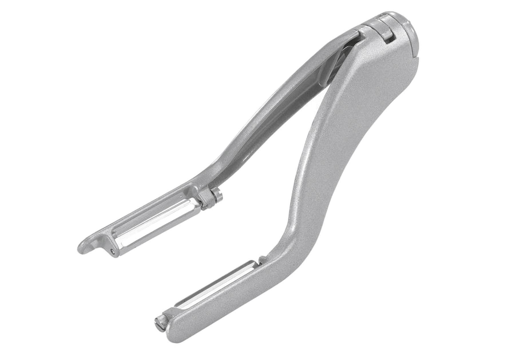 Der Gemüse- / Spargelschäler "Peel-Star" ist ein Spezialschäler mit Zwei-Klingen Prinzip, so wird das Gemüse von zwei Seiten gleichzeitig geschält. Schälen Sie Spargel, Möhren, Zucchini, Aubergine, Gurken und weitere längliche Gemüse im Handumdrehen. Die bewegliche Klinge passt sich dabei optimal allen Konturen der Lebensmittel an. Das hochwertige Aluminium und die robuste, sehr scharfe Klinge aus Edelstahl garantieren Langlebigkeit und optimale Schälergebnisse. Darüber hinaus sind die Klingen ersetzbar. Material: Aluminium / Rostfreier Edelstahl. Maße: 19,2 x 5 x 3,1 cm.Attribute