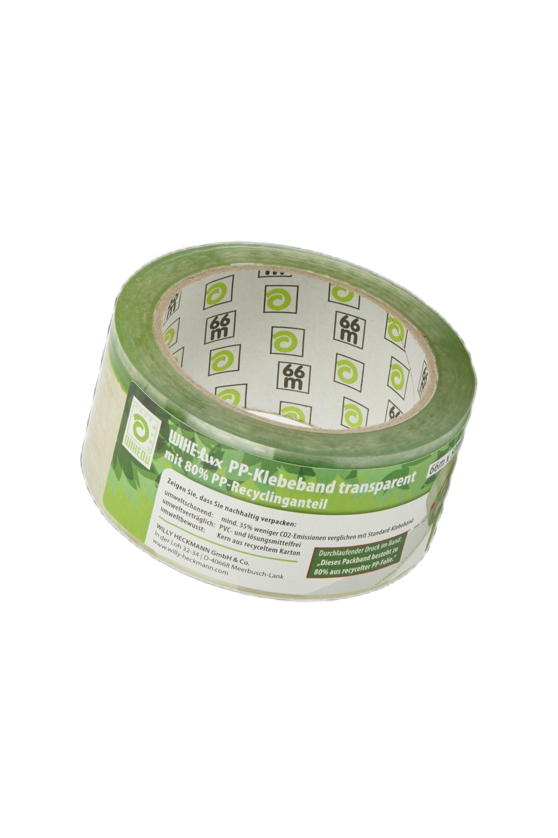 WIHE-lux PP-Klebeband mit 80% PP-Recyclinganteil. Transparent mit grünem durchlaufenden Druck: Dieses Packband besteht zu 80% aus recycelter PP-Folie.Zeigen Sie, dass Sie nachhaltig verpacken: mind. 35% weniger CO2-Emissionen verglichen mit Standard-Klebeband. PVC- und Lösungsmittelfrei. Kern aus recyceltem Karton