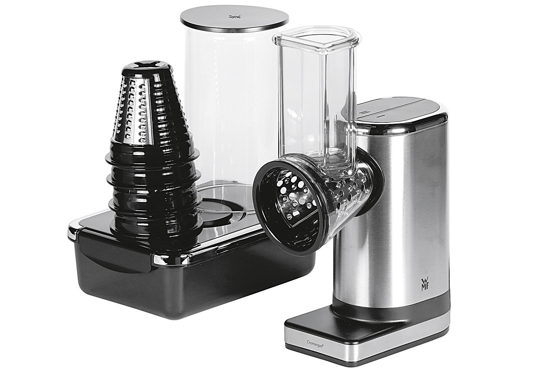 Die WMF Gemüsereibe Salat-to-Go silber ist eine Küchenhilfe, welche viele Obst- und Gemüsesorten schneidet. Selbst das Zerteilen von Nüssen ist mit diesem Gerät einfach zu erledigen. Dies wird durch die fünf auswechselbaren Schneideinsätze ermöglicht. Dank der großen Einfüllöffnung kann das Obst oder Gemüse leicht in die Maschine eingeschoben werden. Die Gemüsereibe besteht aus Cromargan und ist in der Farbe Metallic erhältlich. Sämtliche Komponenten sind spülmaschinengeeignet.Lieferumfang: