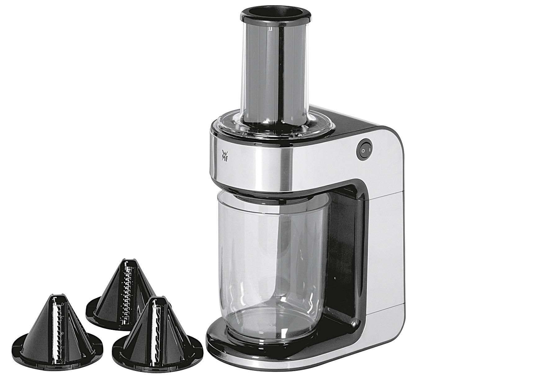 Der Wmf Spiralschneider Kult X schwarz kommt mit einer Leistung von 80 Watt aus. Mit diesem Gerät können kinderleicht Obst- und Gemüsenudeln gemacht werden. Dies geschieht ganz einfach per Knopfdruck.Im Set sind 3 verschiedene Schneidesätze enthalten, mit denen Tagliatelle, Linguine und Spaghetti hergestellt werden können. Der Spiralschneider hat eine Kindersicherungsfunktion, sodass das Gerät nur mit der aufgesetzten Einfüllöffnung eingeschaltet werden kann. Das Gerät schaltet sich nicht automatisch ab. Alle Teile des Geräts können abgenommen und in der Spülmaschine gesäubert werden.Lieferumfang: