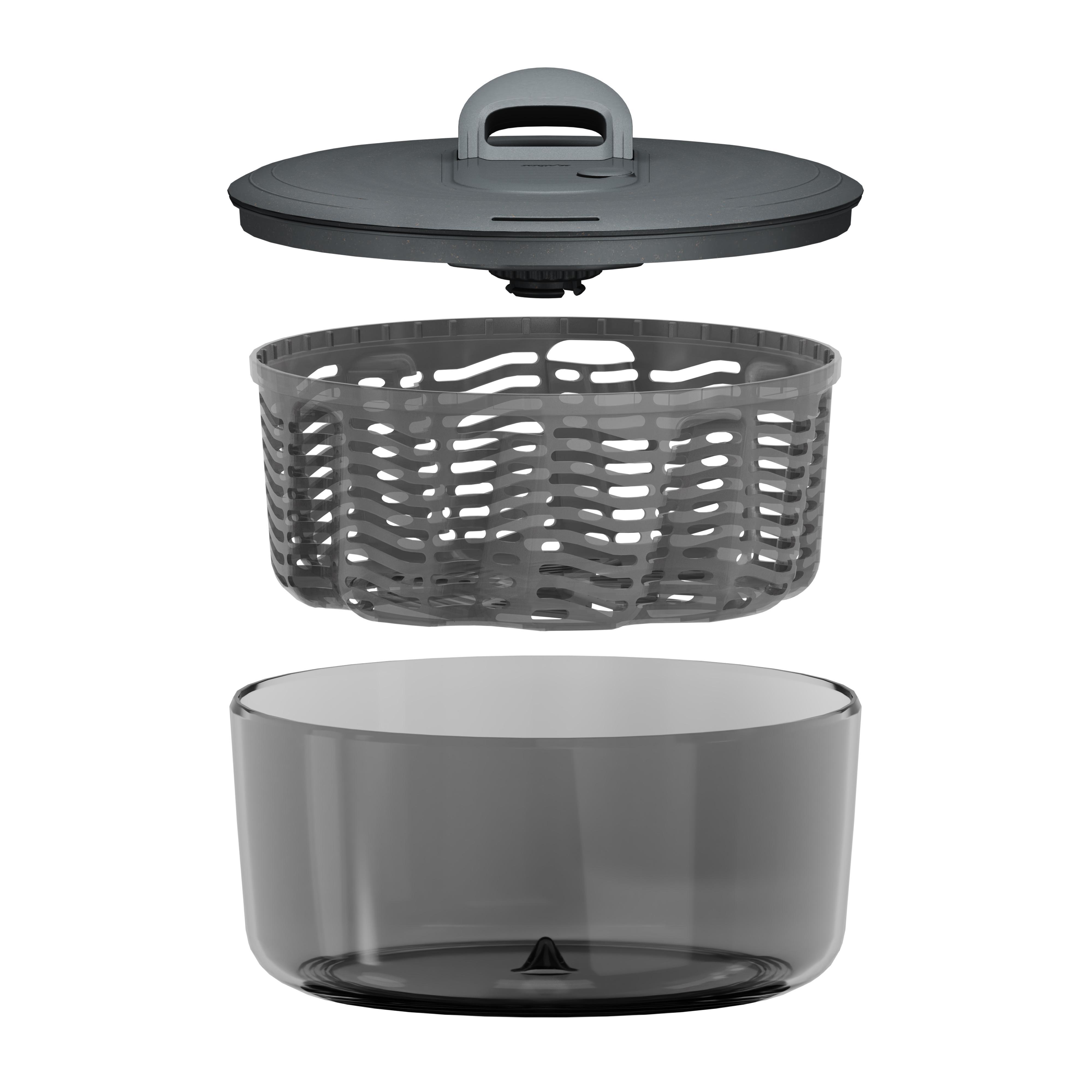 Zyliss Salatschleuder "Easy Spin" anthrazit L - Ø 26 cm. Die Zyliss Easy Spin Salatschleuder L bringt mühelose Effizienz in Ihre Küche. Mit unserer patentierten AquaVent™-Technologie trocknet sie schnell 4–6 Portionen Salat oder Gemüse und extrahiert das Wasser schneller für perfekt knackiges Grün. Der Korb verfügt über griffige Aussparungen, sodass Sie ihn leicht herausheben können. Der klappbare Griff mit Magnetverschluss sorgt für eine kompakte Aufbewahrung, während die Einzugschnur und das Bremssystem eine schnelle und einfache Bedienung ermöglichen. Mit der praktischen Stopptaste haben Sie die volle Kontrolle und können die Schleuder sofort anhalten und Ihren Salat perfekt auflockern. Mit dem Ausgießer kann überschüssiges Wasser abgegossen werden, ohne den Deckel abzunehmen, und der rutschfeste Boden bietet zusätzliche Stabilität während des Gebrauchs. Die transparente Schüssel dient gleichzeitig als Servierschüssel, sodass Sie Ihren frisch zubereiteten Salat direkt am Tisch servieren können. Der obere Deckel ist abnehmbar und die Schüssel, der Korb und die Kupplungsscheibe sind spülmaschinenfest zur einfachen Reinigung. Mit einem zeitlosen und kompakten Design, das bis zu 10 % Weizenstrohmaterial im Deckel enthält, vereint die Zyliss Easy Spin Salad Spinner L Stil, Funktionalität und Komfort in einem.